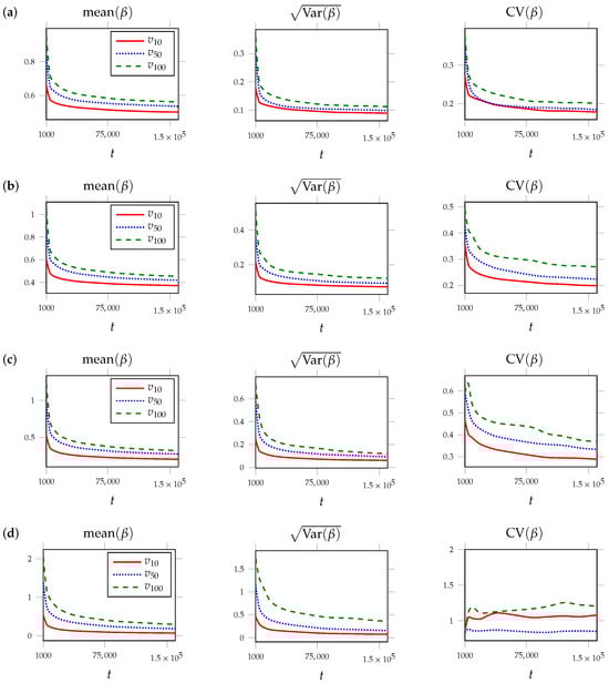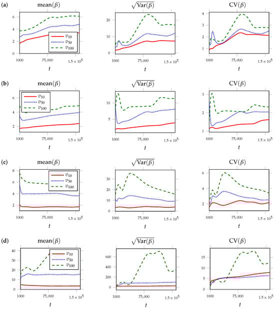 Evolution of the friendship index displayed through trajectories of sample means (left), sample standard deviations (center), and sample coefficients of variation (right) for three vertices, , , found over 1000 networks independently simulated by the BA model with random numbers of attached links for t up to iterations. The networks were built using the power-law-distributed with exponent with the following parameters: (a) , (b) , (c) , (d) . The curves in the simulation results match theoretical derivations obtained previously.