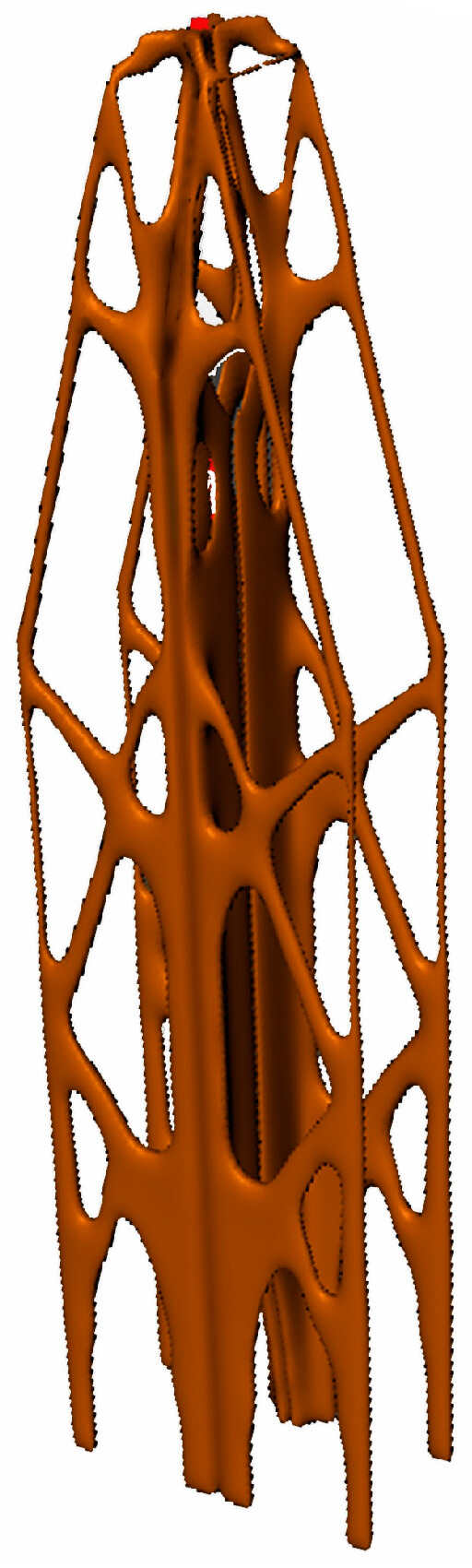 Figure 3 illustrates the computer modeling for topology optimization, featuring a pillar subjected to vertical loading and securely anchored to the ground, thereby establishing fixed boundary conditions. The objective of the topology optimization is to minimize the design volume while simultaneously enhancing stiffness through the reduction in mechanical compliance. This method aligns with Tikhonov’s reciprocity principle, which addresses the non-convex nature of both stiffness and compliance optimization problems. In this study, the Young’s modulus of elasticity is normalized to unity, and the Poisson ratio is set at 0.3 to ensure consistency across all analyses. The results of this optimization process are presented in Figure 4.