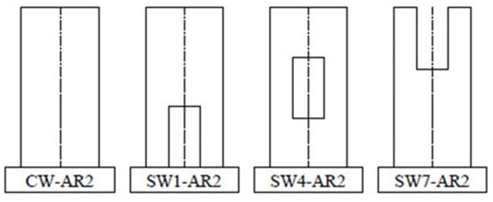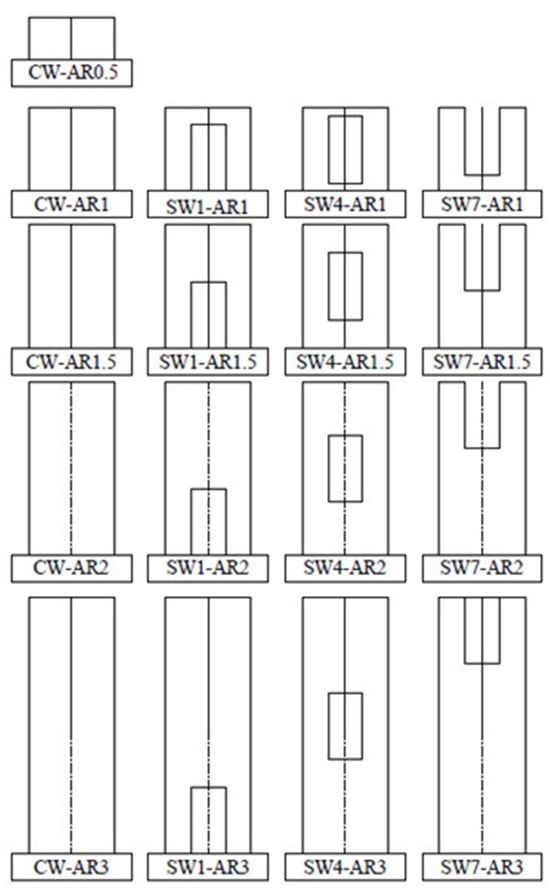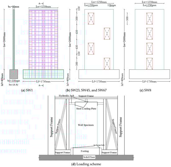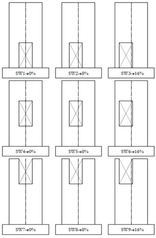 - Wang, J.; Sakashita, M.; Kono, S.; Tanaka, H. Shear behaviour of reinforced concrete structural walls with eccentric openings under cyclic loading: Experimental study. Struct. Des. Tall Spec. Build. 2012, 21, 669–681. [Google Scholar] [CrossRef]