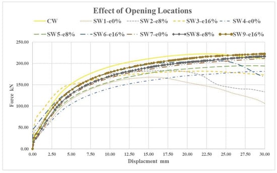 - The opening’s location greatly affects lateral bearing capacity, energy absorption, and stiffness. The ideal opening placement is at the wall’s bottom when the opening is away from the wall center axis, where the wall’s load-bearing capacity is lowered by 18%. When the hole is cut into the wall’s top, its centralization percentage is 16%.