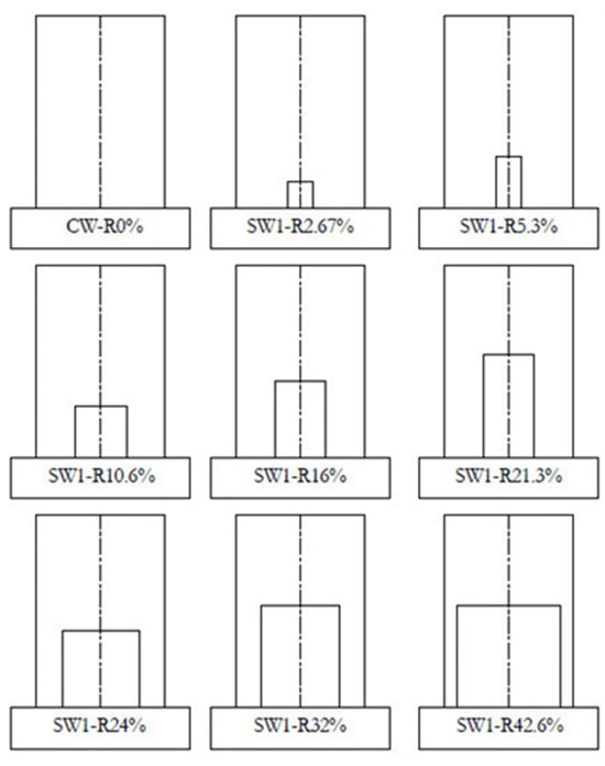 - The opening width exerted a significant influence on the load capacity of the wall. Therefore, it is suggested that any opening in the concrete wall be reduced, the width should not exceed 40% of the total width, and the area of the cut-out hole should not exceed 21% of the entire area of the wall.