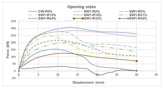 - The size ratio lowered wall capacity and stiffness and increased flexibility and displacement. In addition, opening size ratios below 21% demonstrated that opening height had a modest and undetectable effect on concrete wall loading capacity.