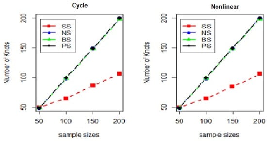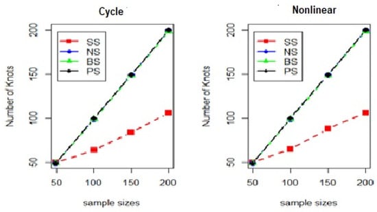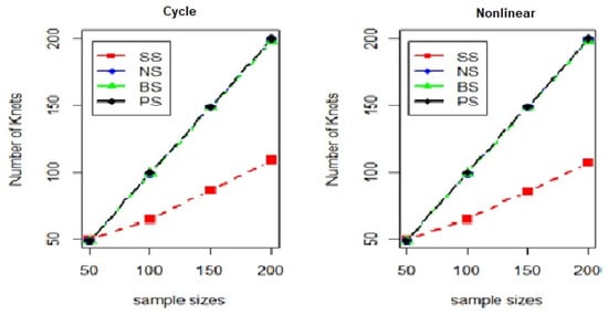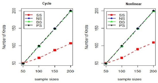 Figure 12. The number of knots for the various methods tends to approach the sample sizes. The average MSE increases as the standard deviation rises, indicating the impact on the model’s fitting performance. Despite the increase in sample sizes, the parameter estimation remained unaffected. The results also show that the natural cubic spline consistently outperforms the other nonparametric regression models.