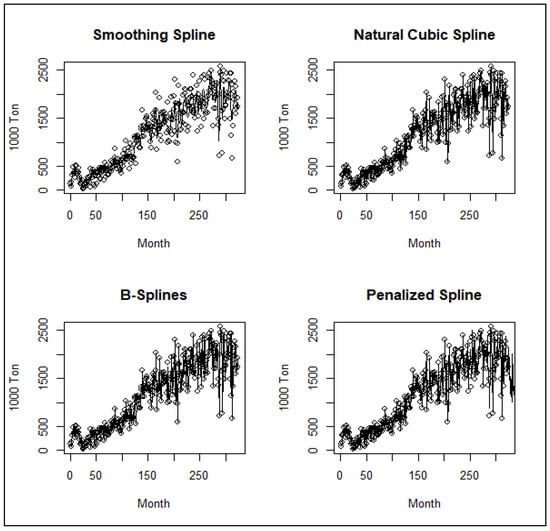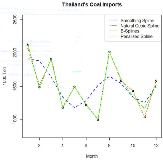 Figure 15 compares four nonparametric regression methods—smoothing spline, natural cubic spline, B-splines, and penalized spline—for modeling Thailand’s coal imports over 12 months. Both the B-splines and penalized spline methods provide the closest fit to the actual data points, while the natural cubic spline also performs well, though with a smoother curve. In contrast, the smoothing spline shows more significant variation and deviates from the other methods, particularly around months 7 and 9. Overall, the B-splines and penalized spline methods offer the best fit for accurately forecasting coal imports.