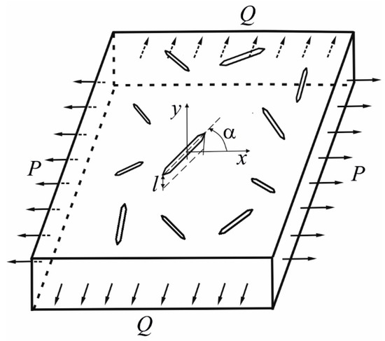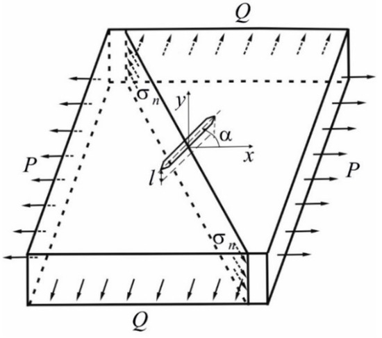 The plate has an area and a thickness and is under the conditions of action of a load uniformly distributed along the edges and . We consider the plane of the crack to be normal to the surface of the plate. The crack forms an angle with the direction of the loading .