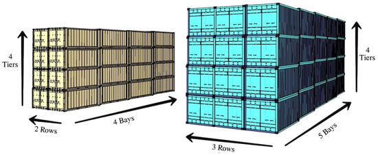 The problem under investigation focuses on an export container yard divided into multiple areas, each one dedicated to serving a specific vessel. Each area contains a set of blocks, and each block is partitioned discretely by bays, denoted as bay-locations in accordance with [40]. Hence, a bay-location is a set of slots that belong to the same bay but are located in different rows and tiers. Each bay-location, according to the rows and tiers, is characterized by a specific capacity (the template defined thanks to a flexible yard strategy). Generally, a single bay-location with four tiers can store 8, 12, 16, or 20 containers if the number of rows is 2, 3, 4, or 5. A sketch is provided in Figure 1. Bay-locations in the yellow block can serve 8 containers while those in the blue block have a capacity of 12 containers. Please note that the baseline of capacity is defined by hosting 20′ containers (i.e., a standard TEU). Storing 40′ and 45′ containers will occupy two contiguous bay-locations (two bays involved). Thus, the template of the yard under investigation is defined as a set B of bay-locations, defined as the union of the sets , with q varying in the set Q of the different bay-location capacities.