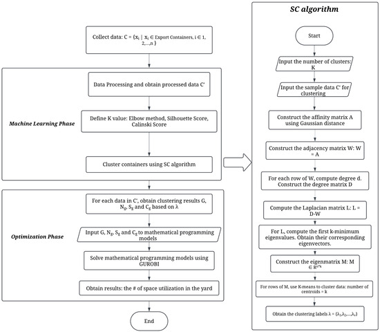 Considering the problem concerning the present work, SC is presumed suitable. Firstly, in the yard under investigation, the scale of export flows to be handled is not extremely massive, depending on the vessels. From the perspective of yard operations, the k value should not be too large. Otherwise, it will lead to a small number of containers in each group, which might harm the utilization of bay-locations, generating more empty slots, and further force material handling equipment to repeat their routes from the yard to the seaside for loading/unloading containers of too many groups. Lastly, the features of containers are peculiar in that most of them are categorical. Please note sizes (20′, 40′, or 45′) and types (Box or High Cube); these are the natural attributes of containers that are fixed and cannot be changed. Even though they can be treated as numerical features, their functionality stays persistent in categorizing containers. As discussed above, SC can deal with categorical features, given that their corresponding eigenvectors will be calculated afterward.