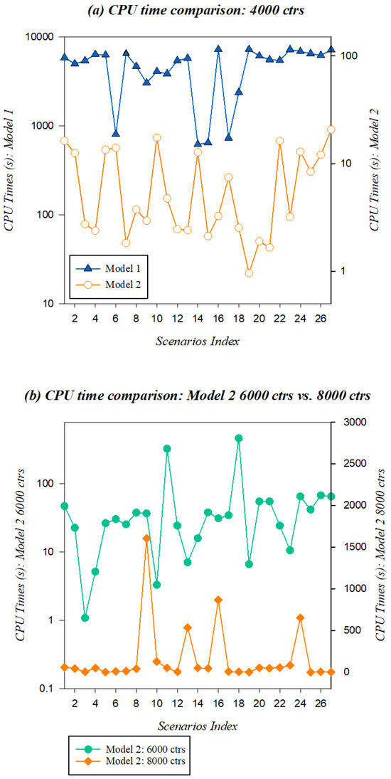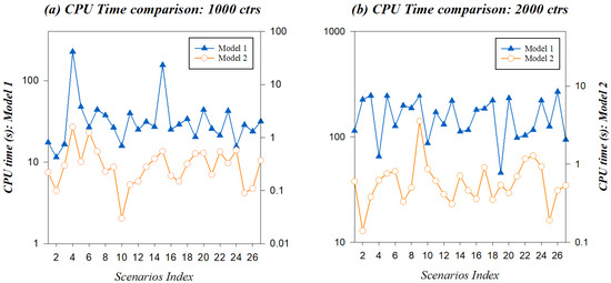 The first campaign aims to investigate the behavior of Model 1 and Model 2 with different scales of instances. All instances are generated randomly but with various proportions of containers in different sizes and weights. Precisely, we have set up 1000, 2000, 4000, 6000, and 8000 containers as five macro categories. For each category, containers are divided into three profiles defined by the proportions of 20′ and 40′ as follows: