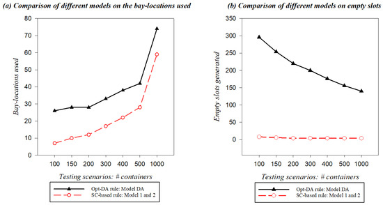 Since the operations in the yard are highly related to material handling equipment, the storage allocation problem is also widely studied with the deployment of handling equipment or problem scheduling, minimizing, generally, the equipment’s movements or congestion ([29,30,31,32,33]). Recently, storage allocation has been studied in an automated terminal by [34], which has a mix-storage policy that permits the storage of inbound and outbound containers.