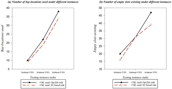 From Table 1, which presents the clustering results obtained by SC solving Instance-T, it can be seen that SC near-optimally meets the demands. Different sizes are distinguished well especially 45′ containers with only 25 units in the input data. For 20′ and 40′, each size of the container is divided into two sub-groups. Slight overlapping in each weight bound can be noted. This might be caused by the feature of destinations. To perfectly cluster containers based on destinations, a high k value is required to respect the number of destinations. However, the metrics have indicated that 5 clusters are the best keeping the highest degree of difference between clusters while holding the similarity of the individual cluster. Therefore, the storage rules under this number of clusters represent better distinction. Features of size, type, and weight are more influential than destinations. Based on these considerations, we omit the overlapping of destinations in this phase. Containers heading to the same destinations can be adjusted later, for example, in the Yard Management Decision Support System. In the present work, we replicate the obtained storage rules per destination as input data for the mathematical programming models.