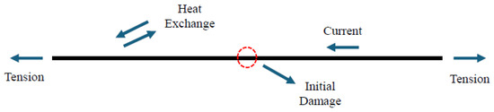Equation (10) describes the heat balance within a system, where (W/(m K)) represents the thermal conductivity, and denotes the net heat exchange. Joule heating, , resulting from the current passing through the conductor, serves as a heat source, while convective cooling, , driven by the wind, acts as a heat sink. Thus, the overall heat exchange can be represented as follows: