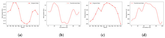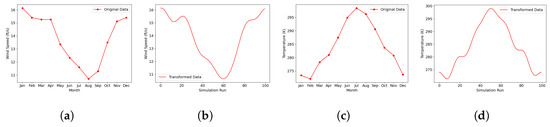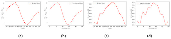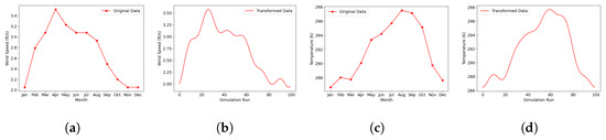 Wind and temperature data for Michigan. (a) Original wind data. (b) Transformed wind data. (c) Original temperature data. (d) Transformed temperature data.