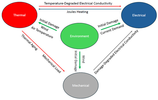 Therefore, operating temperature is considered the primary factor for our analysis. Along with physical effects, material parameters, and loading conditions, these elements determine the failure state of the transmission line over its lifespan. This study aims to understand the multiphysics effects on these critical factors, which are crucial for assessing the transmission line’s reliability.