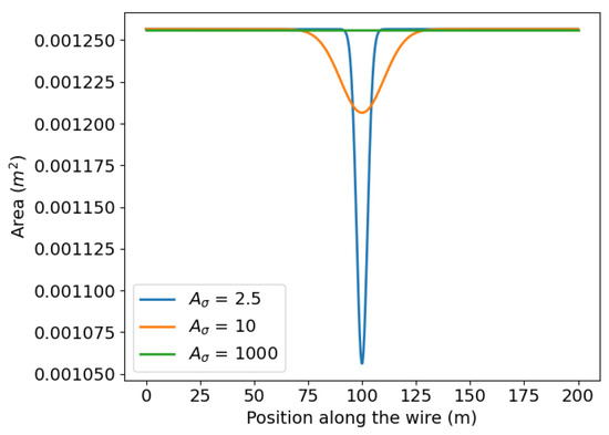 In the transmission line design, various factors such as frequency, inductance, reactance, and electromagnetic interactions with the environment and nearby conductors are considered. However, we are not considering the overall design of the transmission lines; rather, we focus on understanding how current-driven Joule heating affects the reliability of cables with existing damage. Additionally, we do not consider the transient effects of AC currents since they average out over time. Therefore, we use a DC-equivalent mean current, simplifying our approach to measure the heat source term efficiently. Further, to reduce complexity, we parameterize the base value of the current , corresponding to the allowable ampacity for all-aluminum conductors with a diameter of approximately 40 mm. While the current data can be obtained through sophisticated methods, we do not focus on a specific transmission line. Instead, our emphasis is on the voltage drop due to temperature and damage-induced resistivity.