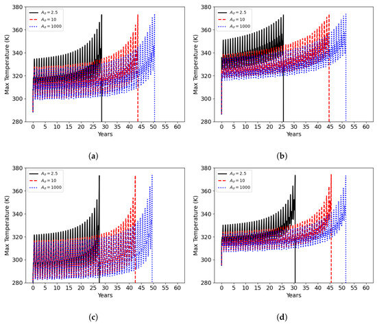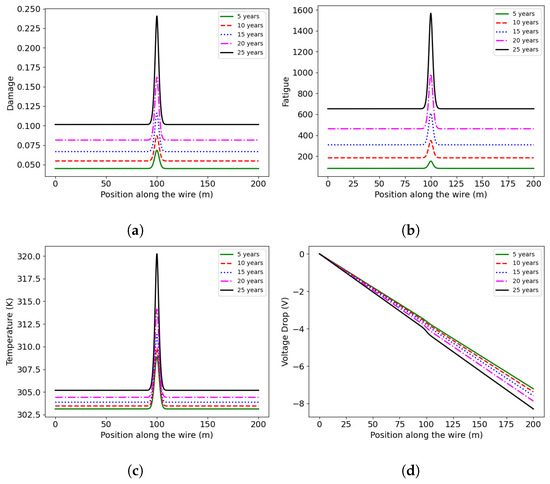 The original model [28] relates fatigue with the increase in temperature due to repetitive and fast loading; however, here, we focus on the long-term damage rather than the short-term increase in temperature. Although the short-term effects are crucial, the long-term reliability of the transmission lines is mainly affected by static loads, environmental conditions, and gradual material degradation. Therefore, we assume a quasi-static regime to simplify our analysis by focusing on steady-state conditions that significantly impact long-term performance. The steady-state heat equation is given by the following: