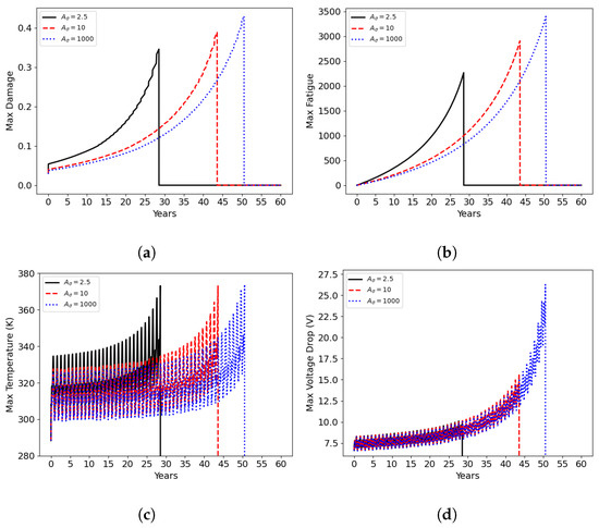 Overall, this model links damage to voltage drop, increasing the power loss due to increased resistance, thus aggravating the thermal load due to Joule heating.