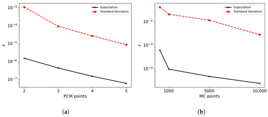 The classical Monte Carlo (MC) method [37,38] is a standard benchmark for studying stochastic solutions that compute the quantity of interest (QoI) in a straightforward fashion. However, this method is characterized by a slow convergence rate and requires a large number of realizations. Some well-established methods, such as polynomial chaos [39,40] or its generalization via Galerkin projection [41,42,43], require modifications to the governing equations for stochastic analysis. This requirement makes these methods intrusive and potentially impractical for complex problems since such modifications may not be feasible or could overly complicate the analysis. To address this, non-intrusive techniques must be used; one such technique is the probability collocation method (PCM) [44,45]. PCM preserves the simplicity of solution structures and allows for independently sampled realizations, thereby achieving better convergence compared to the traditional Monte Carlo (MC) method. Although the curse of dimensionality challenges PCM due to tensorial products, this issue can be effectively addressed using techniques such as sparse grids [46] or active subspace methods [47,48,49].