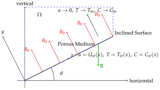 In this work, we consider the steady, two-dimensional boundary layer flow of a Casson fluid over an inclined nonlinear stretching surface embedded in a Forchheimer porous medium. The flow domain Ω R 2 is defined such that the x-axis lies along the inclined surface, and the y-axis is normal to it. The inclination angle of the surface is θ with respect to the horizontal axis. A schematic diagram of the physical model is depicted in Figure 1.