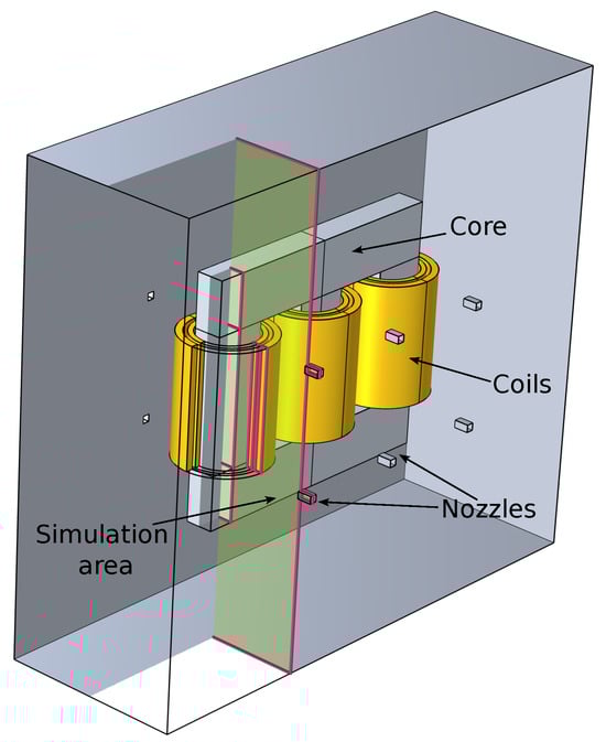 - Das, A.K.; Chatterjee, S. Finite element method-based modelling of flow rate and temperature distribution in an oil-filled disc-type winding transformer using COMSOL multiphysics. IET Electr. Power Appl. 2017, 11, 664–673. [Google Scholar] [CrossRef]