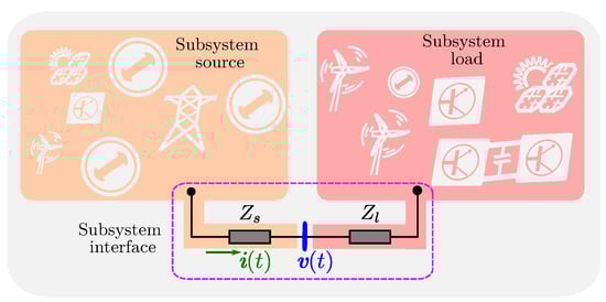 The system under study is split into two parts that encompass the load and source subsystems. The interface between them is a series impedance that could represent a tie-line, feeder, transformer, or branch of a passive filter, among others. The line current and the terminal voltage link both subsystems, as shown in Figure 1.