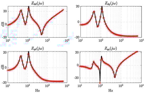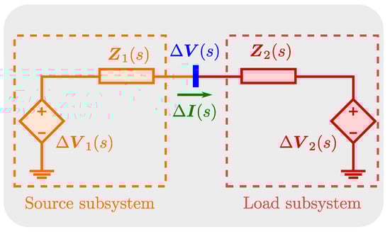 In the last decades, the power electric system has experienced a transition towards the growing penetration of voltage source converters (VSCs). Traditionally, the eigenanalysis using the selective modal analysis (SMA) [] has been used to evaluate the operating point stability [,]. Recently, the impedance-based method has been gaining popularity for the understanding of the oscillatory problems related to port interactions between the load and source subsystems []. This method was originally presented to study DC–DC converters in the 1970s [], and can be applied even if some system information is missing. This method leads to an equivalent electric circuit, and tools such as the two-port networks [] or the Kron reduction technique [] can be used. The impedance model is the key item to assess the small-signal behavior, which can be obtained by either linearizing the nonlinear dynamical model or through an identification process using measurements of simulations.