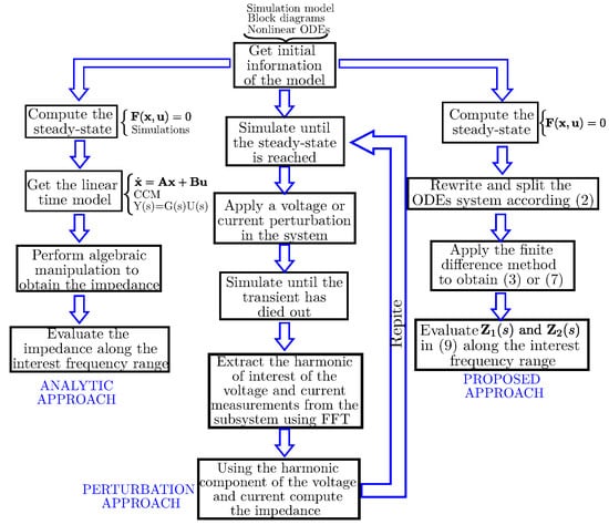 A more detailed explanation of the derivation of formulas is given in Appendix A. The presented formulation uses the series inductor current for subsystem coupling, although coupling via a shunt capacitor voltage at the PCC is feasible with a slightly different formulation. The essential steps for computing the impedance model are outlined in Figure 3. Regardless of the approach, model data are essential, sourced from various methods like large-signal models, time-domain simulations, or the real system. In our proposal, we utilize the nonlinear model. Each method follows distinct stages to obtain the impedance model, as depicted in Figure 3, where blocks denote several tasks. In the analytical method, achieving steady state involves time-domain simulations or solving nonlinear equations from the large-signal model. The most time-intensive stages include deriving the linear model and performing algebraic manipulations for the impedance model. The perturbation approach requires repetitive time-domain simulations, notably taxing for stiff or poorly damped systems, demanding small time steps and lengthy simulation periods. FDIM’s impedance evaluation is time-consuming, akin to the analytical method, yet notably faster than the perturbation and analytical methods’ lengthy stages. FDIM is not suitable for black box models, as it, akin to the analytical method, stems from (1) or its linearized form.