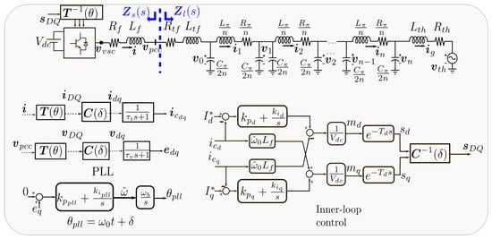 The system in Figure 4 is an inverter that only has an inner-current control loop. The DC-link is a constant voltage source. Low-pass filters are used to measure the signals of voltage and current. The connection to the grid is through a transformer (represented by its RL parameters), the tie-line is modeled using several cascade PI circuits to include the high-frequency response of the conductors, and the grid is modeled as a Thévenin equivalent. The model of this system is in a general synchronous reference frame (denoted with capital ) and uses the following transformation to change from to :