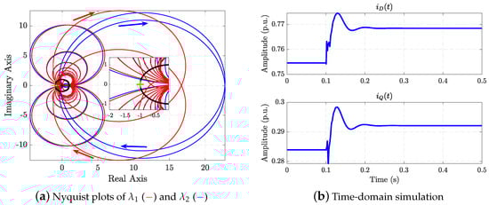 Once the impedance models are computed, system stability can be evaluated using the generalized Nyquist criterion (GNC) []. The traces of the eigenvalues of the open-loop gain, , are plotted, and encirclements around in the complex plane are checked. If has no unstable poles and the traces do not encircle the critical point, the system is stable. Figure 7a shows the traces of under rated conditions, neither encircling . Checking , no unstable poles are found, confirming system stability.
