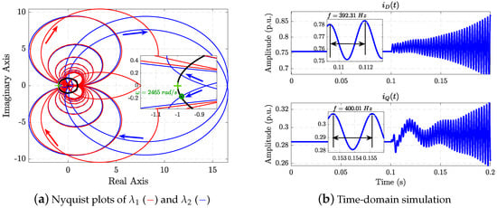 A simulation is conducted to verify the Nyquist traces. First, the system is simulated until it reaches a steady state, then the current reference is increased by 2%. Figure 7b shows stable waveforms of the current , matching the previous outcome. However, if the gain changes, the system can become unstable. When , the open-loop gain has two unstable poles, making the system unstable unless the traces of and encircle the critical point twice counterclockwise. Figure 8a shows no encirclements, indicating instability. The time-domain simulation results in Figure 8b confirm the Nyquist prediction.