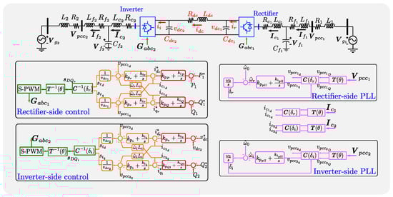 Figure 9 shows the second example used to reaffirm the proposed method. Both stations of the HVDC-VSC are working with the typical vector control in the dq-frame; the rectifier-side controls the active () and reactive power () at the (). Whereas the inverter-side controls the voltage in the DC-bus () and the reactive power () at the (). Both stations use PLLs to make the synchronization with the grid.