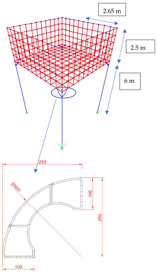 Figure 2 and Figure 3 illustrate the elevated tanks equipped with a curved frame damper. Two distinct types of tanks are analyzed: a ’tall’ tank characterized by a height-to-radius ratio (H/R) greater than 1, and a ’broad’ tank with an H/R ratio of 1 or less [32]. The height of the broad tank is 2.5 m and the radius is 2.65 m, while the height and the radius of the tall tank is 4 m and 2.65 m, respectively. The columns supporting the tanks reach a height of 6 m and feature Circular Concrete-Filled Steel Tubes (CFST) with a diameter of 0.406 m and a wall thickness of 0.0063 m. The tank shell has a thickness of 15 mm and is constructed from S275 steel. The concrete used in the CFST cross-section is classified as C25/30, and the steel utilized is S275.