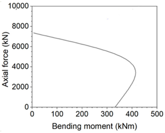 The inelastic behavior of composite sections is described according to Katsimpini [31]. A finite element-based numerical model has been created and validated against previously established experimental data. Leveraging a substantial database derived from finite element analysis, this study proposes analytical empirical relationships for determining the bearing capacity of circular composite columns. These relationships provide a direct, succinct, and efficient means of calculating the ultimate strength of CFT members, which is beneficial for engineering design applications. Figure 4 presents an interaction axial force bending moment curve derived from the proposed equations of [33].