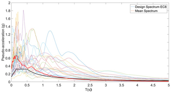 In this study, 11 unique earthquake recordings (accelerograms) were employed to carry out non-linear time history (NLTH) analyses on the elevated reinforced concrete tank. These recordings were selected based on their adherence to the Eurocode 8 [3] criteria for utilizing real earthquake records in NLTH analyses. The analysis takes into account all three directional components of each earthquake recording, which include two horizontal components and one vertical component. Table 2 documents the name of each earthquake, the date of occurrence, the location of the recording station, its moment magnitude (Mw), and the ground conditions at the recording site. The ground conditions are classified as HR for hard rock, SR for sedimentary and conglomerate rock, and SL for soil/alluvium. Additionally, Figure 5 illustrates the spectrum of seismic motions in conjunction with the design spectrum of EC8 and their mean spectrum.