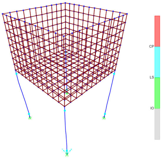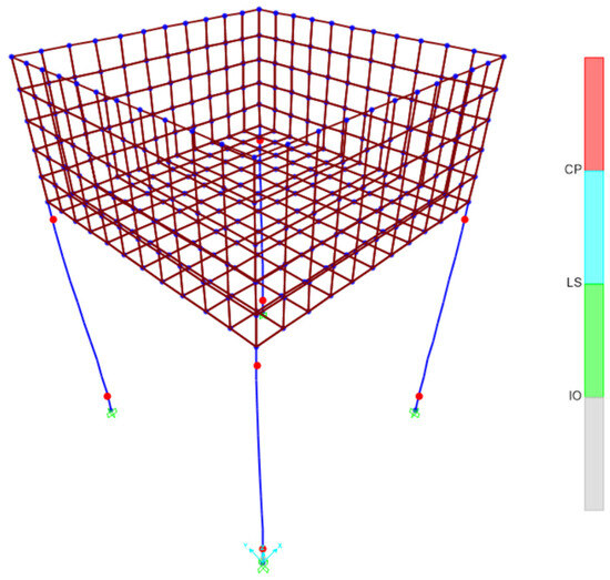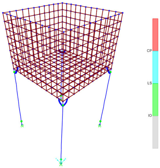 An analysis of the least favorable scenarios for broad elevated tanks (Figure 6), one incorporating a steel curved damper and the other a conventional elevated tank, highlights notable differences in their seismic performance, particularly in the formation of plastic hinges. The structure with the steel curved damper (Figure 7) shows the emergence of plastic hinges in composite columns located beneath the Immediate Occupancy (IO) level, suggesting an ability for controlled deformation and energy dissipation. Conversely, the unprotected tank (Figure 6) exhibits a more pronounced response, with composite columns reaching the Collapse Prevention (CP) level, indicating a heightened risk of failure during seismic events.