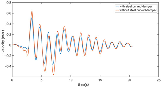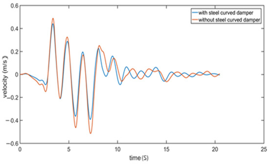 Figure 8 presents a comparison of the velocity time history for the tall elevated tank, illustrating the significant role of the steel curved damper in reducing peak velocities. Without the damper, the structure experiences peak velocities nearing 0.65 m/s, whereas the integration of the steel curved damper lowers these peaks to approximately 0.50 m/s. The damped system demonstrates more stable velocity oscillations during the seismic event, featuring smoother transitions between peaks and diminished residual velocities. This reflects a greater capacity for energy dissipation and superior control of the structure’s dynamic behavior in response to earthquake forces.