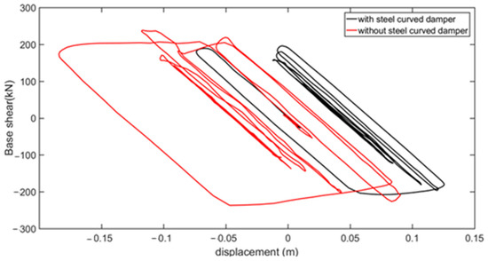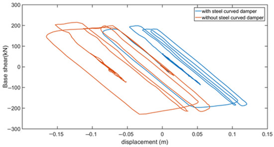 The analysis of hysteresis loops for the broad tank reveals that the incorporation of the steel curved damper significantly enhances energy dissipation (Figure 10). Without this system, the peak base shear reaches approximately 280 kN, with displacements ranging from −180 mm to 90 mm. In contrast, the implementation of the steel curved damper results in a reduction in the maximum base shear to around 210 kN, while the displacement is limited to approximately −40 mm to 120 mm. The hysteresis loops generated with the steel curved damper exhibit greater clarity and stability, indicating improved energy absorption capabilities. Additionally, the area enclosed by these loops is larger, signifying a more efficient dissipation of seismic energy.