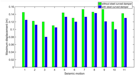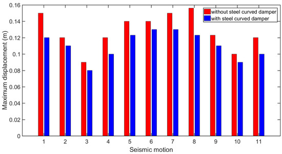 An analysis of maximum displacement shows considerable variations between tall tanks that are safeguarded and those that lack protection when compared to different earthquake records (Figure 19). The application of the steel curved damper consistently lessens the maximum displacements noted at the top of the elevated tank. The most substantial reductions are found in records 1 and 9, where the damper achieves a reduction in peak displacements of around 25–35%. The related graph indicates that the damping system is notably adept at reducing lateral movements during severe seismic activities, thereby promoting greater structural stability and safety.
