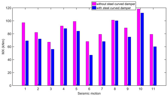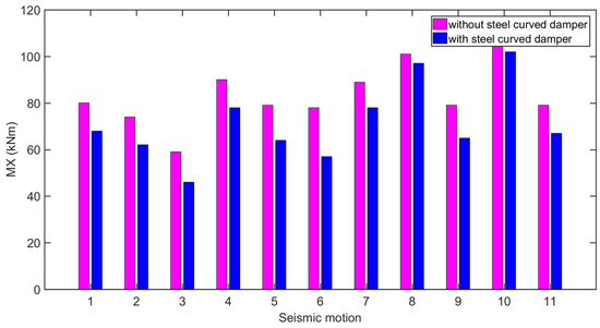In Figure 20, a comparison of maximum moments in the X direction along the tall tank wall is presented, showcasing the impact of the damping system on force distribution. The use of the steel curved damper leads to a significant reduction in the maximum moments experienced by the tank structure, with reductions of between 20% and 40% across different seismic events. The most considerable reductions are noted in events 4, 6, and 9, highlighting the damper’s effectiveness during severe ground motions. This reduction in moments is essential for bolstering structural integrity and reducing the likelihood of damage to the tank walls.