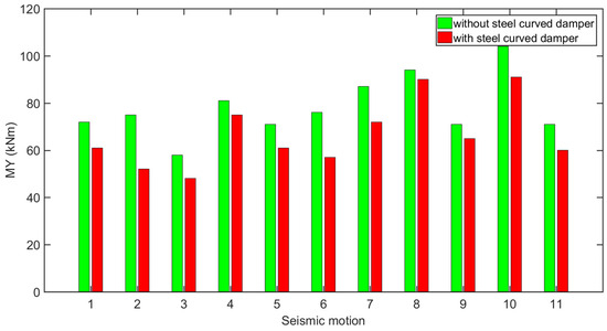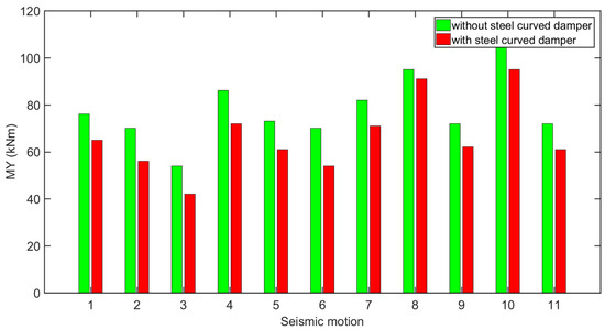 Analyzing the maximum moments in the Y direction, as depicted in Figure 13, highlights the positive effects of the steel curved damper. The results consistently show a reduction in moment magnitudes across all seismic records, with the most notable improvements occurring in records 2, 4, and 7. The damped system reveals maximum moments that are approximately 25–35% lower than those of the unprotected tank. This reduction in Y direction moments reflects a more even distribution of forces and an enhanced seismic performance, especially in regulating the bi-directional response of the tank structure during earthquakes.