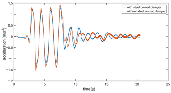 Analysis of the acceleration time history for the broad tank demonstrates a considerable decline in peak accelerations when the steel curved damper is utilized (Figure 17). In the absence of this damper, the maximum acceleration reaches about 1.5 m/s2, whereas the implementation of the system results in a peak of approximately 1.4 m/s2, indicating a reduction. Moreover, the steel curved damper seems to enhance the damping characteristics of the acceleration response following peak events.