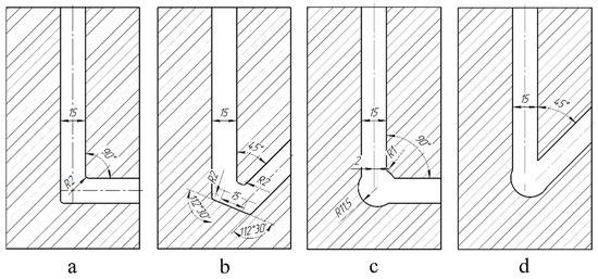 The geometry of the dies being modeled: (a) Channel junction angle 90°; (b) channel junction angle 45°; (c) channel junction angle 90° with spherical cavity; (d) channel junction angle 45° with spherical cavity.