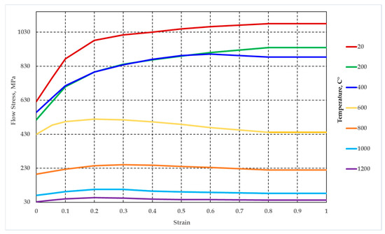 The elastic-plastic state of the material is described by the following ratios: σxx = Eε at ε < εY and σxx = σY at ε ≥ εY (here, εY = σY/E—strain yield strength at linear loaded state) [17]. For AISI 52,100, the strain–stress curves for different temperatures are presented below in Figure 3.