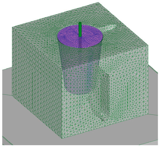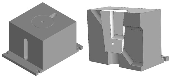 As part of this study, a casing specially designed for pressing was used for strength analysis; its design is shown in Figure 4. This casing has a conical hole for inserting the half-dies, which ensures reliable fixation and uniform distribution of loads during the pressing process. An opening is provided in the bottom of the casing, which allows using the lower ejector available in some presses to push the half-dies back after the process is completed. In addition, there are side holes in the casing design through which the finished pressed blanks are pushed out. This design facilitates the operation of the tool and speeds up the process of replacing the die and removing the workpiece. Figure 5 shows the finite element mesh of the parts under study.