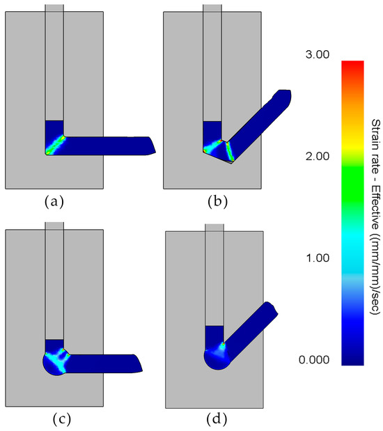 The distribution of the effective strain rate for the four die configurations is presented in Figure 6.