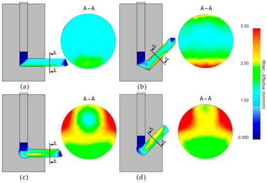 Significantly large levels of deformation are inherent in the pressing schemes (c) and (d). Most of the cross-section has a level of deformation of about 1.5 mm/mm, but its distribution is sufficiently irregular. The highest values of inclined deformation correspond to the areas symmetrically located relative to the axis of the workpiece, located on the upper lateral points of the workpiece. The strain-effective values here reach 4.3 mm/mm for circuits (c) and up to 6 mm/mm for circuits (d). The axial zone of the workpiece is much better developed in comparison with previous schemes, up to 2 mm/mm. However, in schemes (c) and (d), closer to the upper point of the workpiece, there is a small zone with low strain-effective values up to 1 mm/mm.