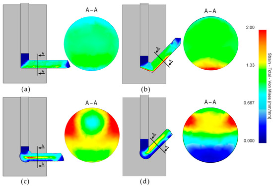 When comparing the obtained von Mises strain data and the total level of accumulated strain (equivalent strain), it can be noted that for cases a and b, the levels of both types of strain are almost identical, which indicates that during deformation in the matrices of these structures, the workpieces receive predominantly only shear strain. This is also the reason for the identical shape of the strain distribution over the workpiece cross-section. Significant differences have already been observed in cases (c) and (d). In addition to the shear strain at the channel junction, the workpiece is subject to crushing in this zone due to the spherical expansion of the joint. As a result, the equivalent strain level consists of shear and tensile strain in a proportion of approximately 65% and 35%, respectively.