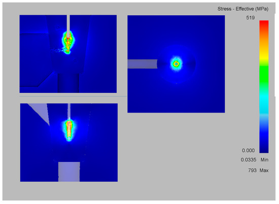 The stress analysis took into account the yield strength of the die material. For AISI 52,100 steel, this parameter is ≥518.42 MPa. The specified yield strength value corresponds to a temperature of 500 °C (the zone between the blue and yellow curves on the vertical axis in Figure 3), since this temperature will occur in the immediate contact zone in the die channel with the heated workpiece. Exceeding this value indicates the possibility of plastic deformation of the material. The stress distribution showed that the maximum values are observed on the surface of the die channel (Figure 10), which indicates a potential slight plastic deformation in this area.
