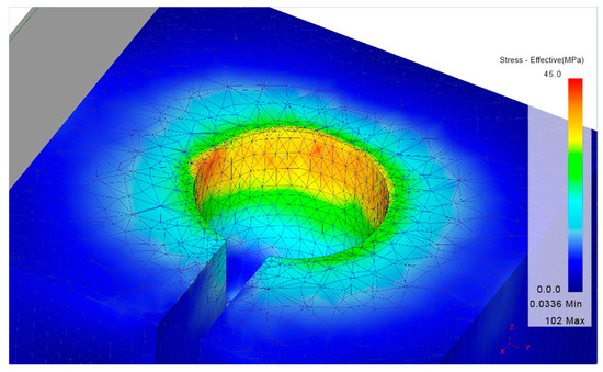 The stress level on the walls of the casing supporting the die did not exceed 45 MPa (Figure 11), which is significantly lower than the yield strength of the casing material and indicates its sufficient strength.