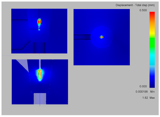 The deformation level of the channel walls was estimated by the displacement parameter. The maximum displacement values reached 0.5 mm on the surface of the die channel, which may indicate the possibility of damage to these areas. However, no significant deformation was detected in the volume of the die (Figure 12).