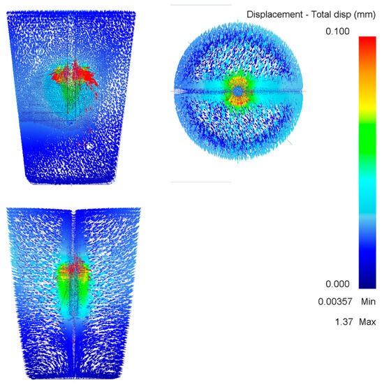 For a more detailed analysis of the direction and magnitude of deformations, displacement vectors for each mesh node were considered (Figure 13 and Figure 14). It can be seen that the half-dies, in addition to deformations on the surface of the channel, experience lateral displacements, trying to shift to the sides. There are also offsets in the direction opposite to the output channel. The relative displacement of the half-dies was about 40 µm. There was a tendency for the die material to “squeeze out” of the casing. The casing showed significantly smaller movements (Figure 14). The main deformations occurred on the surface of the walls of the die socket and did not exceed 40 µm. More intensive movements are noted in the area of the output cutout of the casing, which is due to its design features.